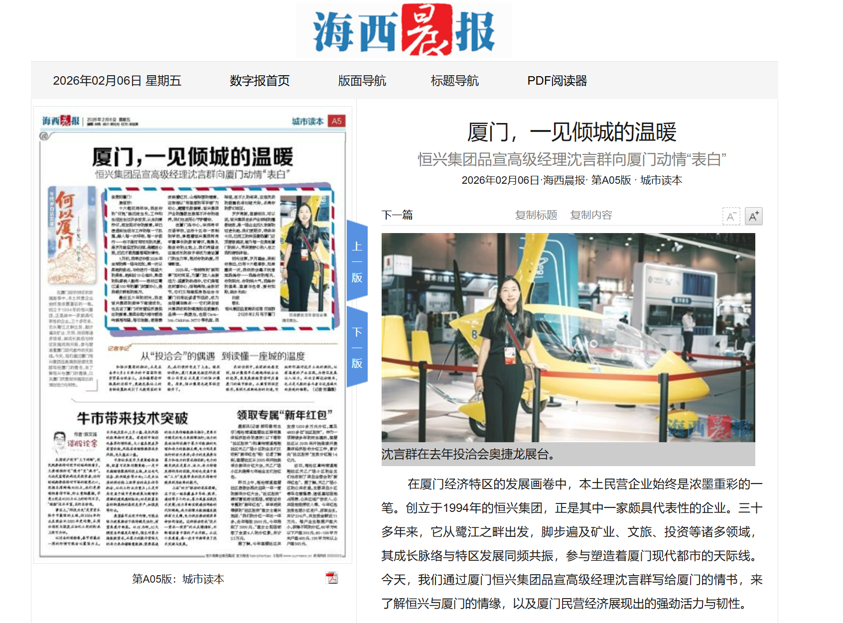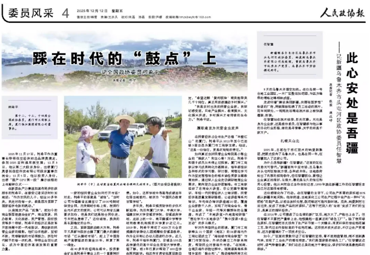 【人民政協(xié)報(bào)】2025年12月12日,人民政協(xié)報(bào)專訪柯希平文章《踩在時(shí)代的“鼓點(diǎn)”上》,刊登于第4版“委員風(fēng)采”欄目,照寧記者手記《致敬民營(yíng)企業(yè)家,致敬奮斗者》同步刊登??孪F剑旱谑⑹?、十四屆全國(guó)政協(xié)委員,廈門市工商聯(lián)主席,廈門恒興集團(tuán)有限公司董事長(zhǎng)。2025年11月27日,柯希平作為董事長(zhǎng)帶領(lǐng)低空經(jīng)濟(jì)知名品牌奧捷龍,參加2025亞洲通用航空展;12月3日,他以第二大股東身份,出席廈門奧普拓自控科技有限公司股東董事交流會(huì);12月5日,他以投資人身份,出席“國(guó)產(chǎn)GPU第一股”摩爾線程的上市敲鐘儀式……在新質(zhì)生產(chǎn)力賽道加速布局并收獲頗豐的柯希平,在接受記者采訪時(shí)樸實(shí)地說:“作為農(nóng)民的兒子,創(chuàng)業(yè)30多年來,我走對(duì)的每一步,都是因?yàn)榫o跟了國(guó)家經(jīng)濟(jì)命脈的跳動(dòng)。”從肩挑農(nóng)產(chǎn)品“趕集”,到如今的商業(yè)版圖涵蓋冶金礦產(chǎn)、商業(yè)貿(mào)易、民辦教育、文化旅游、資產(chǎn)管理、股權(quán)投資等多個(gè)領(lǐng)域,柯希平的經(jīng)歷正是改革開